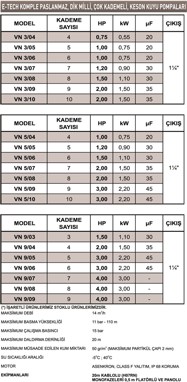 E-Tech VN 3/05 Trifaze 1 HP Komple Paslanmaz Keson Kuyu Pompası