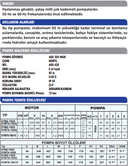 Sumak SYM6-150/8 - SYMT6-150/8 Yatay Milli Kademeli Pompa
